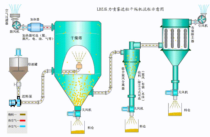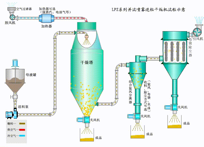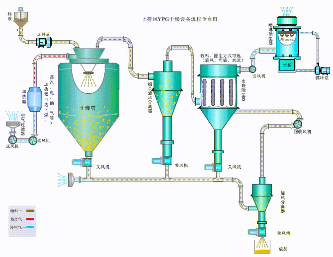 (3)生產(chǎn)過程簡化,操作控制方便。對(duì)于含濕量40-60%(特殊物料可達(dá)90%)的液體能一次干燥成粉粒產(chǎn)品,控制和管理都很方便。